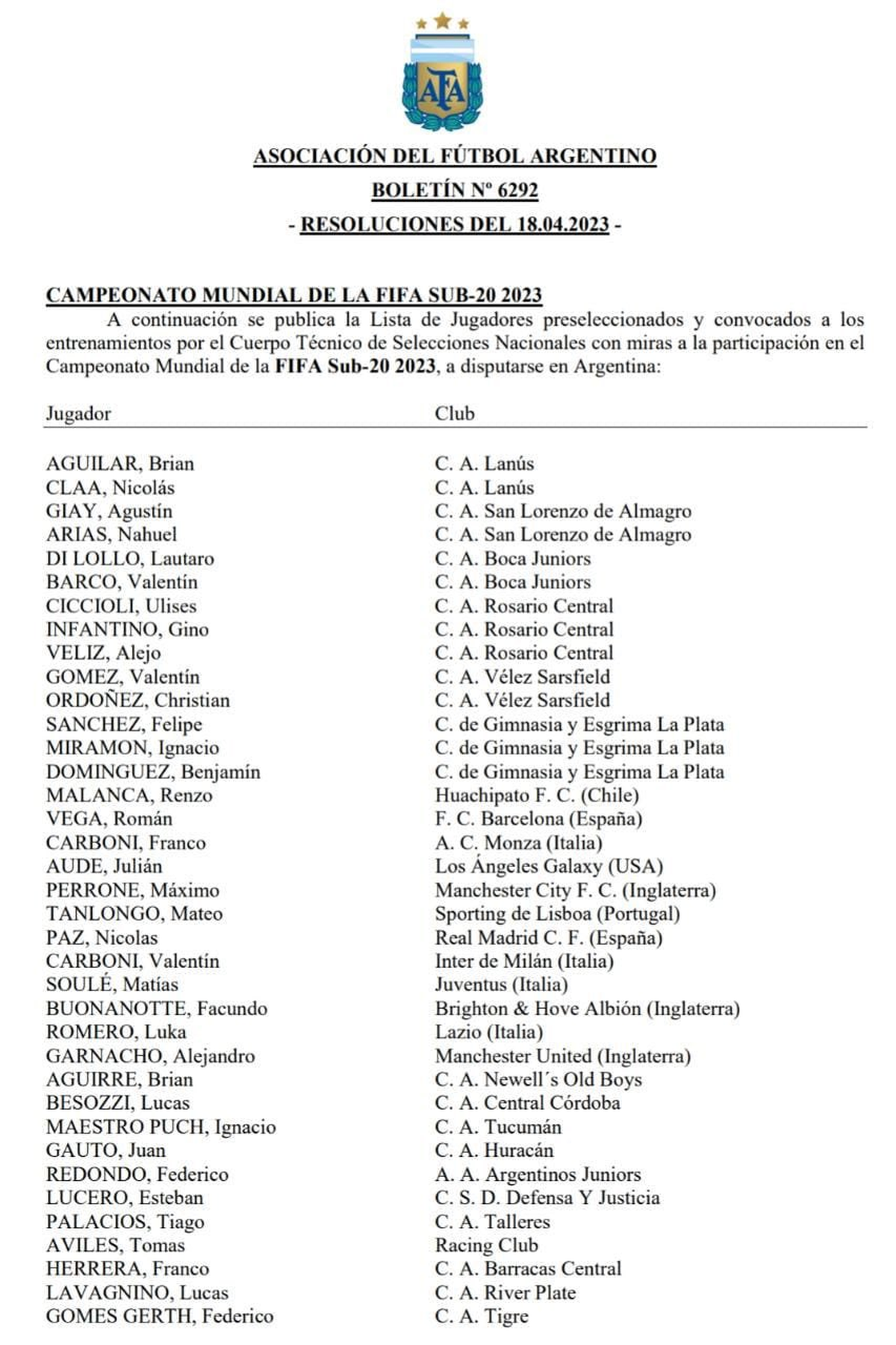 La lista fue presentada esta noche por la Asociación del Fútbol Argentino mediante el boletín oficial.