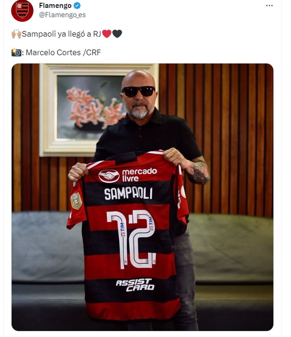 "El comandante llegó a Río de Janeiro. Buena Suerte, Sampaoli", escribió la cuenta oficial del "Fla" junto a una foto del DT con una camiseta con su nombre y el número 12.