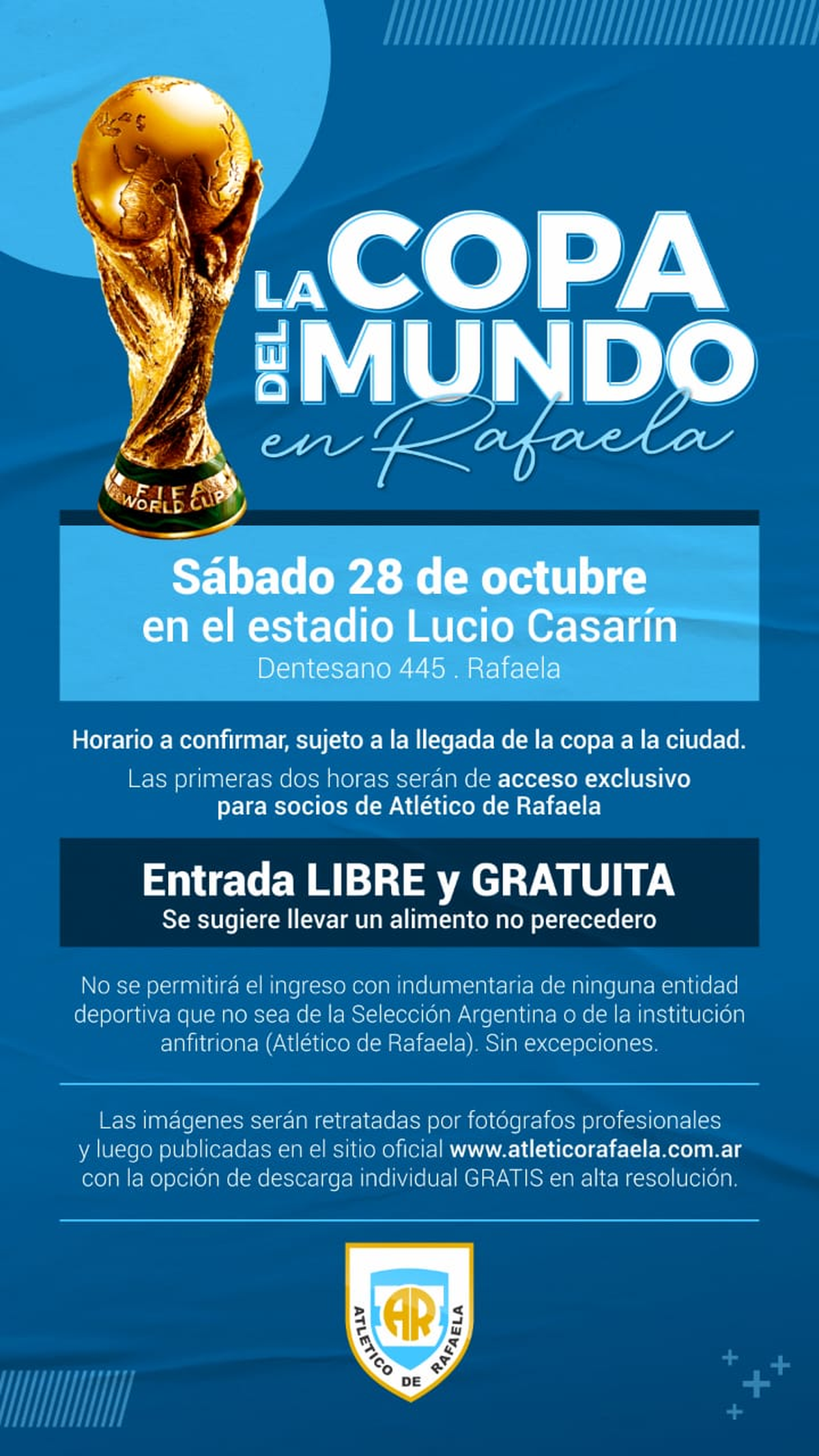 La Copa del Mundo que la Selección Argentina ganó en el Mundial de Qatar 2022 llegó a Rafaela. Este sábado el trofeo que ganó Lionel Messi estará en el gimnasio "Lucio Casarín" de Atlético Rafaela. Es abierto a todo público.