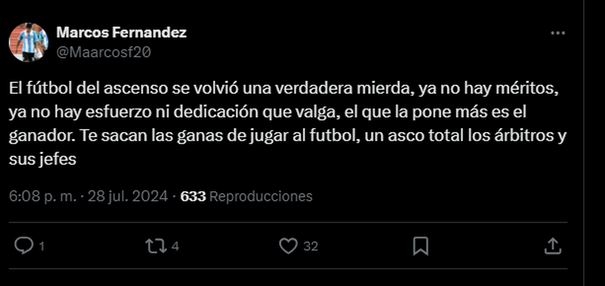 El ex jugador de Colón, Marcos Fernández, emitió un duro mensaje en sus redes sociales, tras una polémica situación vivida en un partido correspondiente al Federal A.