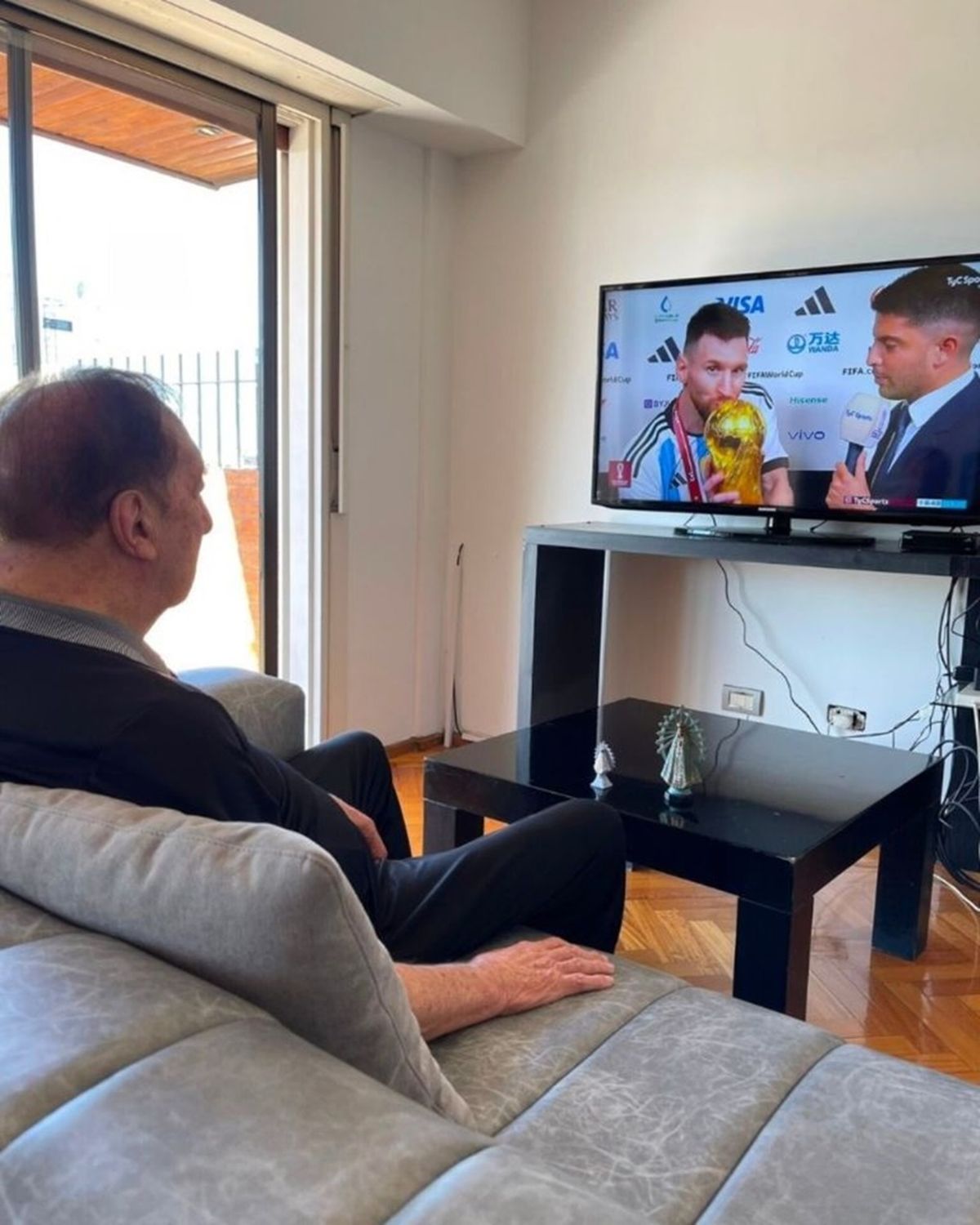 En ese sentido, el ex entrenador argentino fue fotografiado en un sillón, de espaldas, mirando el televisor y a Lionel Messi dando una entrevista con la Copa del Mundo, esa que él supo tener en México 1986, y que este revivió en su casa.