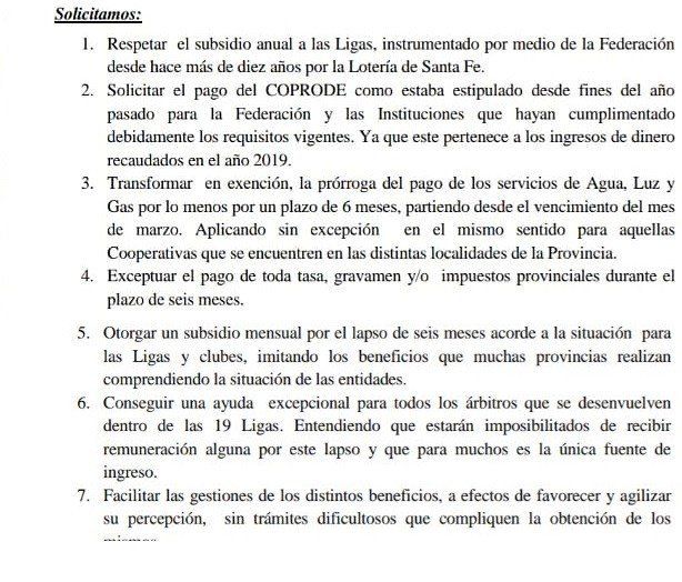 "Nuestra Federación nuclea a 450 clubes, realizando contención social a más de 150 mil jugadores federados y a sus familias. Estas instituciones también proveen empleo a unas 10 mil personas de manera directa y otros 5 mil afectados de manera indirecta", reza parte del escrito elevado al gobernador Perotti.