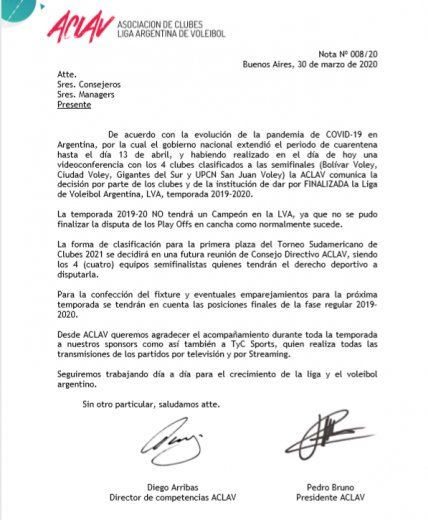 La Asociación de Clubes Liga Argentina de Vóleibol (ACLAV) y las cuatro instituciones que llegaron a semifinales en la competencia que se desarrolló en la presente temporada decidieron dar por finalizado el torneo 2019-2020, a causa de la pandemia de coronavirus. Dirigentes de ACLAV y de los clubes Bolívar Voley, Ciudad Voley, Gigantes del Sur de Neuquén y UPCN de San Juan acordaron hoy, tras videoconferencia, interrumpir definitivamente el certamen, luego de que el Gobierno Nacional decretase la extensión del aislamiento social preventivo obligatorio hasta el próximo 13 de abril.