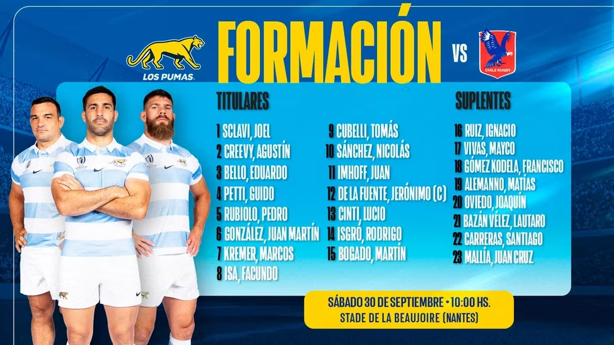 El seleccionado de rugby de Argentina, Los Pumas, presentará 11 cambios para jugar el sábado ante Chile, por el Grupo D del Mundial de Francia 2023, con relación al equipo que venció a Samoa por 19 a 10.