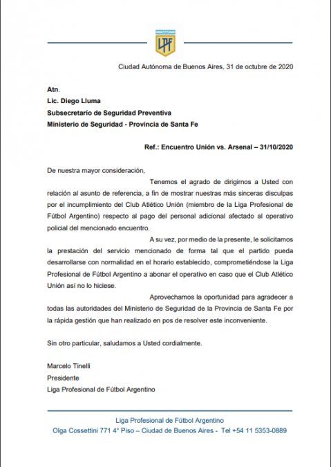 Debido a esta situación, el presidente de la Liga Profesional, Marcelo Tinelli, remarcó su agradecimiento al Ministerio de Seguridad de la Provincia de Santa Fe, por la rápida gestión en solucionar este inconveniente, y mostrar "sus más sinceras disculpas por el incumplimiento del Club Atlético Unión".