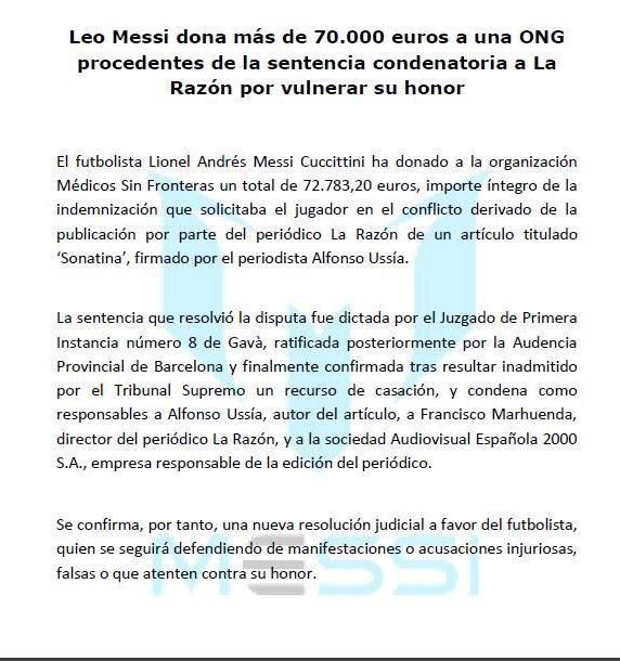 El 7 de junio de 2016, Messi ganó el juicio contra el diario La Razón, con sede en Madrid y propiedad del Grupo Planeta, que había publicado un artículo titulado “Sonatina”, firmado por el periodista Alfonso Ussía, atentando contra el honor del rosarino.