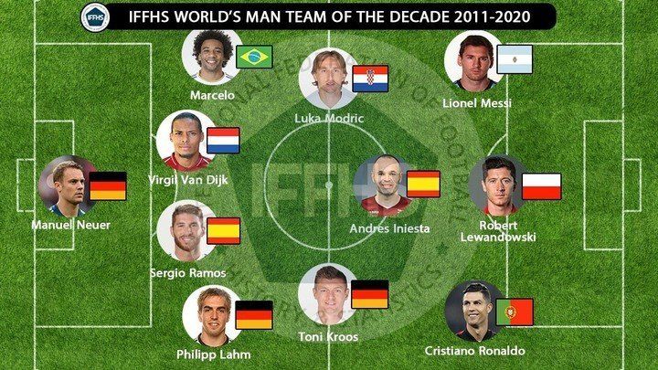 En tanto en el equipo mundial de Europa para la IFFHS figuran el portugués Cristiano Ronaldo, el español Sergio Ramos, el alemán Tony Kroos y el brasileño Marcelo, entre otras figuras. En el once de la década hay cuatro jugadores del Real Madrid (Ramos, Marcelo, Kroos y Luka Modric) más CR7, que jugó en el club hasta 2018.