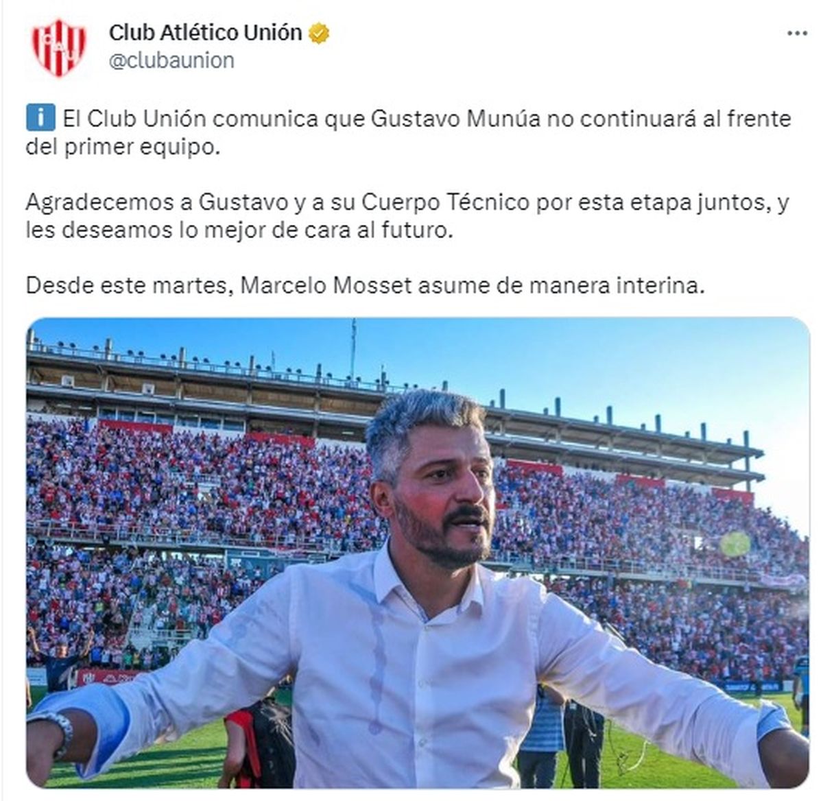 Gustavo Munúa no continuará al frente del Club Atlético Unión, así lo confirmó la institución deportiva a través de las redes sociales. Desde este martes Marcelo Mosset asume de manera interina. La decisión llegó tras la derrota del equipo tatengue con River Plate y de un arranque de torneo negativo para el DT uruguayo.