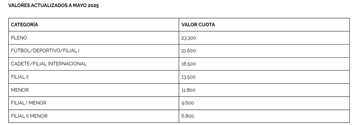 CATEGORÍAVALOR CUOTAPLENO23.300FÚTBOL/DEPORTIVO/FILIAL I21.600CADETE/FILIAL INTERNACIONAL16.500FILIAL II13.500MENOR11.800FILIAL I MENOR9.600FILIAL II MENOR6.800