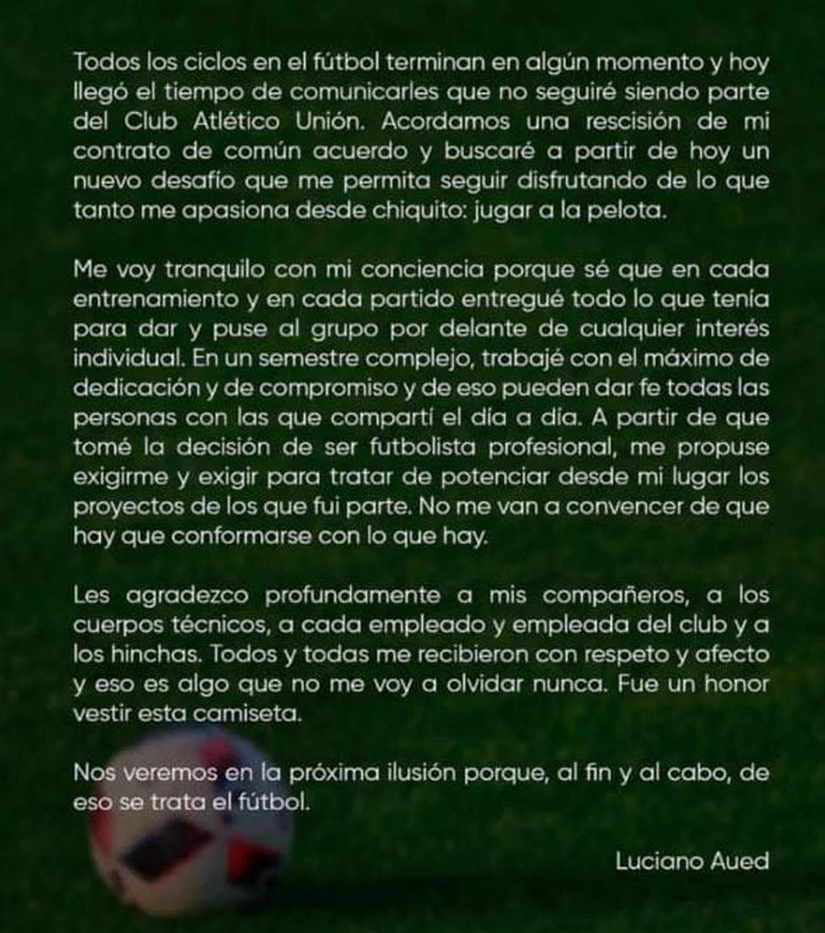 El mediocampista de Unión utilizó sus redes sociales para despedirse del club atlético Unión. "Me voy tranquilo", expresó Luciano Aued en un extenso mensaje que compartió en su cuenta de Instagram.