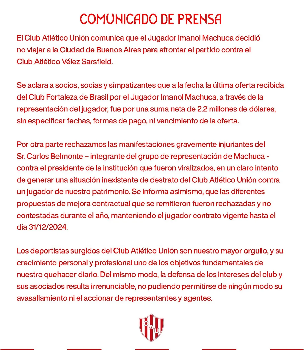 Recordemos que todo comenzó luego de que Imanol Machuca y su entorno tomaran la decisión de no jugar este lunes ante Vélez, Unión de Santa Fe emitió un comunicado donde informa a la masa societaria del club cómo se desarrolló la situación y apuntan contra el jugador, quien presiona para irse al Fortaleza de Brasil.