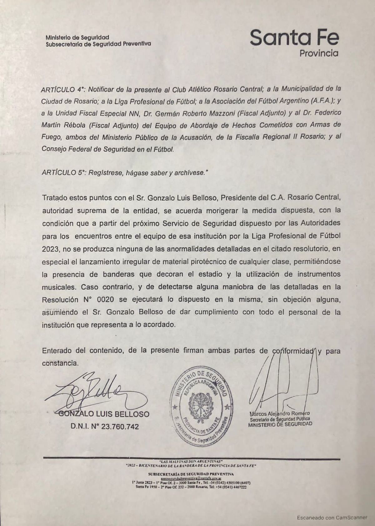 El Presidente de Rosario Central, Gonzalo Belloso se reunió con el Secretario de Seguridad Pública, Marcos Romero, a partir de una sanción que había recibido nuestra Institución, que impedía la utilización de banderas y demás elementos folclóricos en los próximos partidos como local.