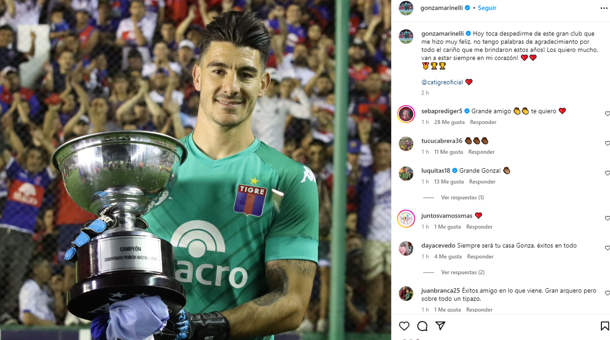 En sus redes sociales, Gonzalo Marinelli dejó un mensaje de despedida: "Hoy toca despedirme de este gran club que me hizo muy feliz, no tengo palabras de agradecimiento por todo el cariño que me brindaron estos años. Los quiero mucho y van a estar siempre en mi corazón".