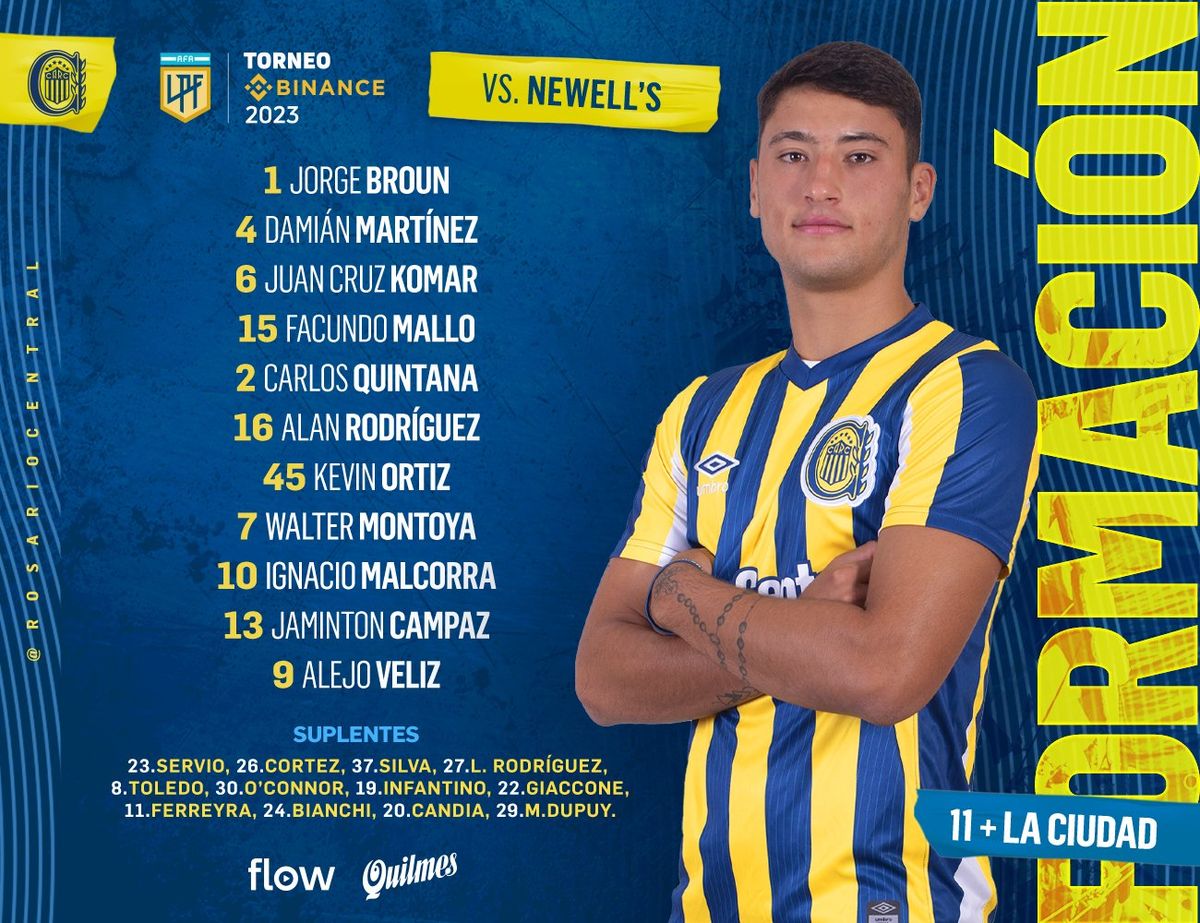Rosario Central: Jorge Broun; Damián Martínez, Juan Cruz Komar o Lautaro Giaccone o Gino Infantino, Facundo Mallo, Carlos Quintana y Alan Rodríguez; Ignacio Malcorra, Walter Montoya, Kevin Ortiz y Jaminton Campaz; Alejo Véliz. DT: Miguel Ángel Russo.