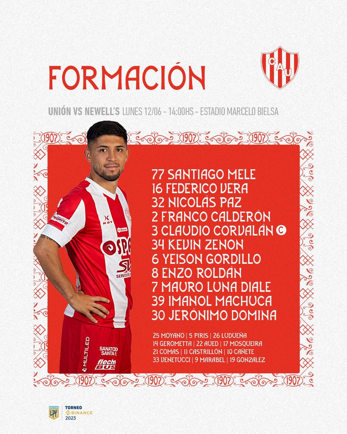 Unión: Santiago Mele; Francisco Gerometta, Franco Calderón, Claudio Corvalán y Nicolás Paz; Kevin Zenón, Yeison Gordillo y Enzo Roldán; Mauro Luna Diale e Imanol Machuca; Jerónimo Domina. DT: Sebastián Méndez.