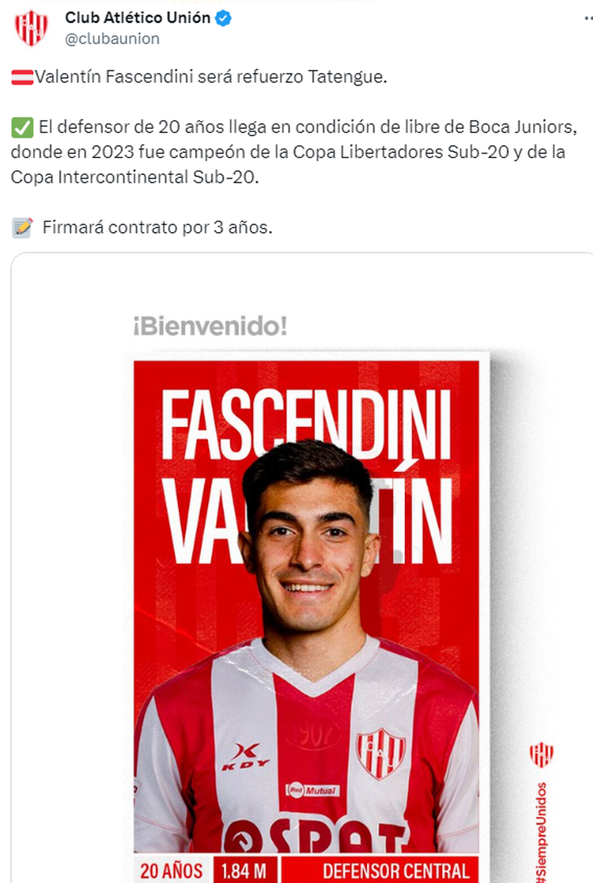 Valentín Fascendini será refuerzo de Unión y firmará un contrato por 3 años. El defensor de 20 años llegará en condición de libre de Boca Juniors, donde en 2023 fue campeón de la Copa Libertadores Sub-20 y de la Copa Intercontinental Sub-20.