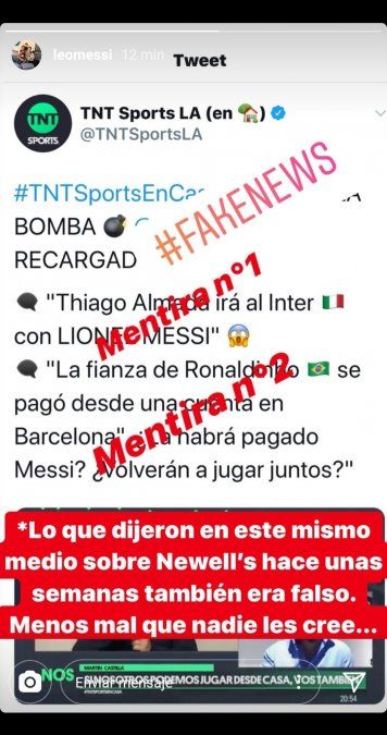 El argentino reprodujo un pantallazo del tweet con las dos noticias y escribió encima de ellas "mentira nº1" y "mentira nº2", además de añadir que "lo que dijeron en este mismo medio (por TNT Sports) sobre Newell's hace unas semanas también era falso. Menos mal que nadie les cree...", para añadir la etiqueta #FakeNews,