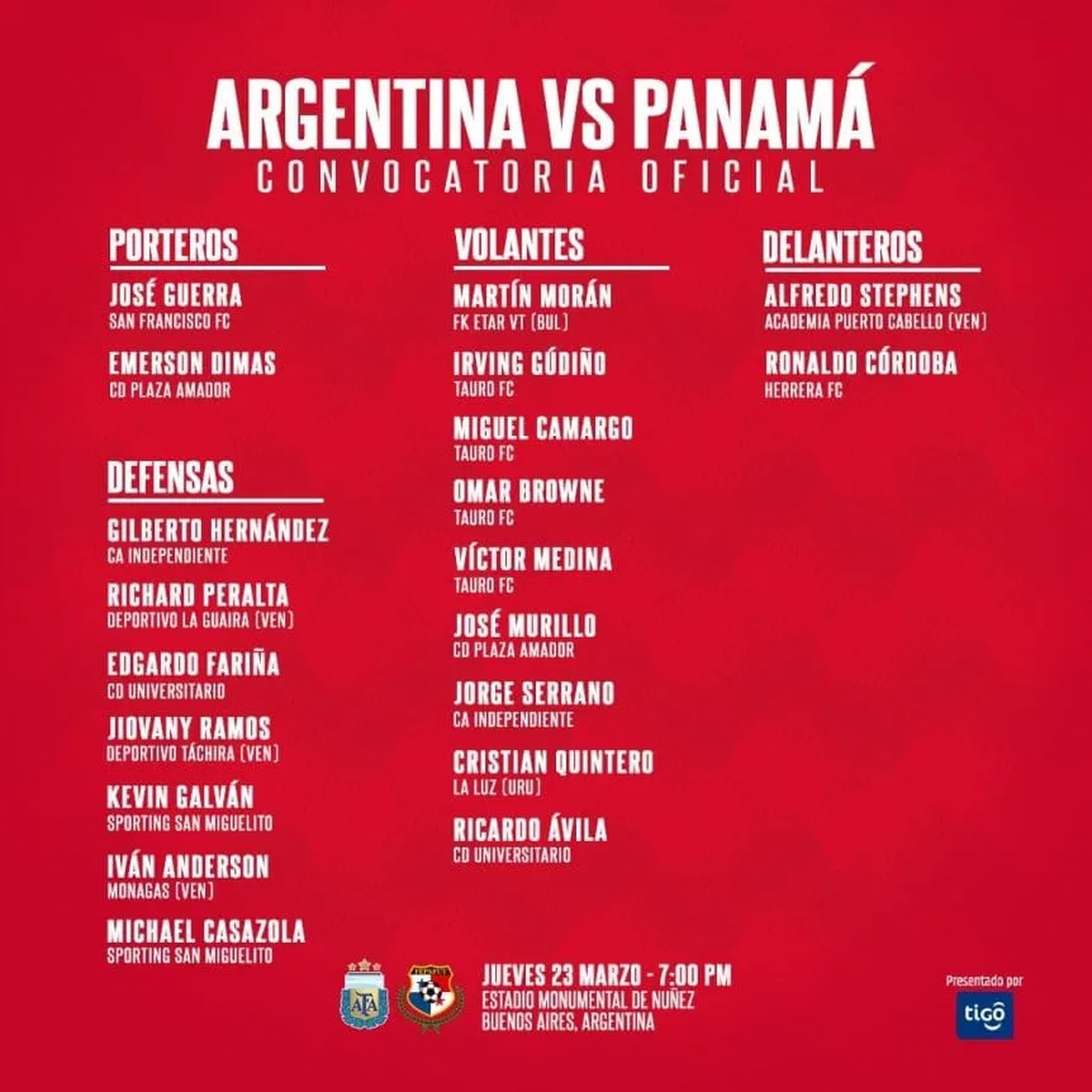 - Argentina vs. Panamá | Jueves 23 de marzo, Estadio Monumental.