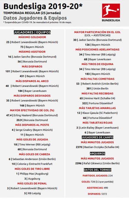 La Bundesliga se interrumpió luego de haberse jugado 25 fechas con el Bayern Munich, ganador de los últimos siete campeonatos en forma consecutiva, como líder con 55 puntos, seguido por el Borussia Dortmund con 51 y el Leipzig con 50, en las principales posiciones, y cuando restan jugarse nueve jornadas.