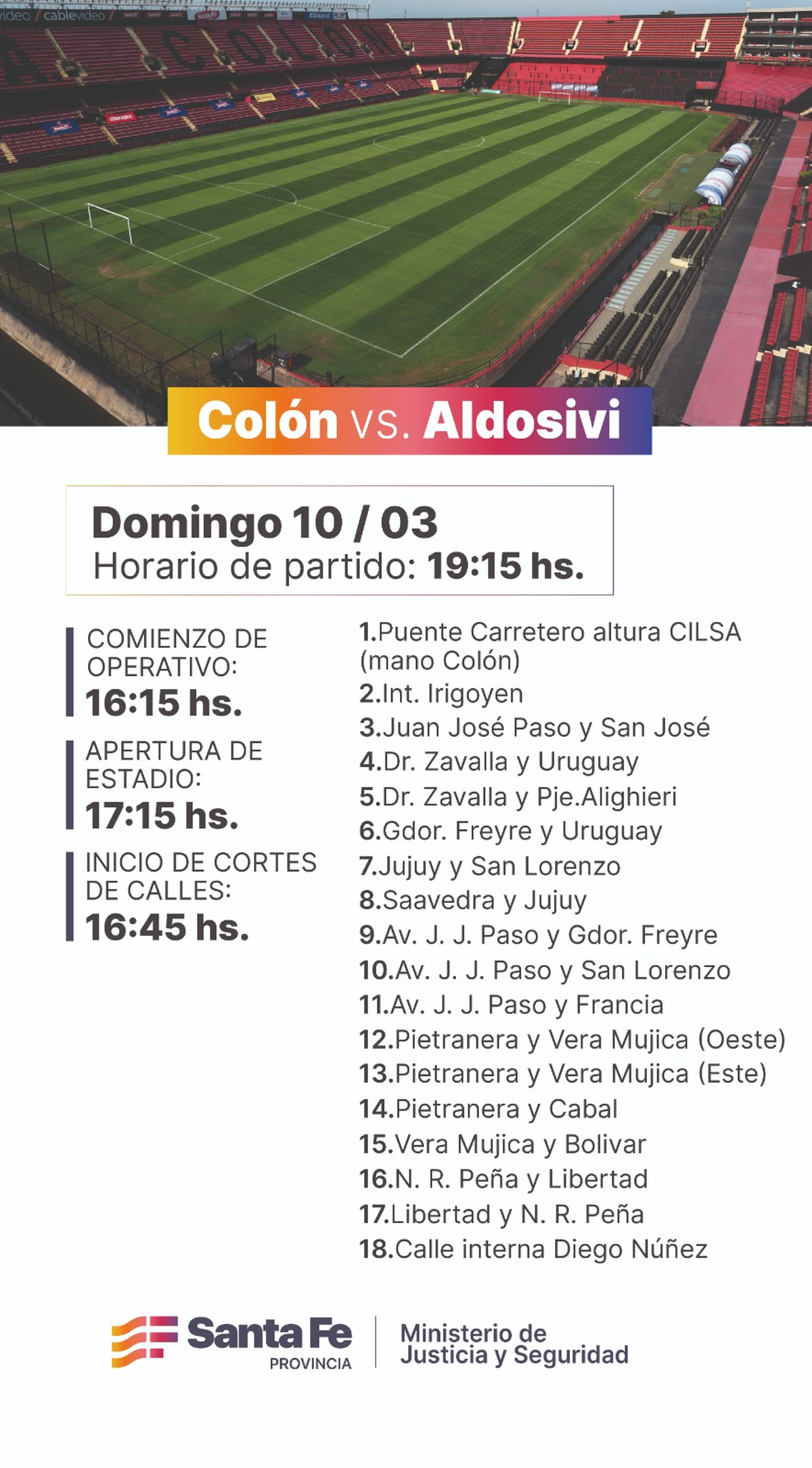 Según averiguó AIRE, todas las tribunas del estadio de Colón estarán habilitadas como en el último partido, aunque el operativo de seguridad será más intenso que ante Patronato de Paraná. "No se podrán ingresar banderas ni instrumentos en la tribuna Sur", confirmó el Ministerio de Seguridad.