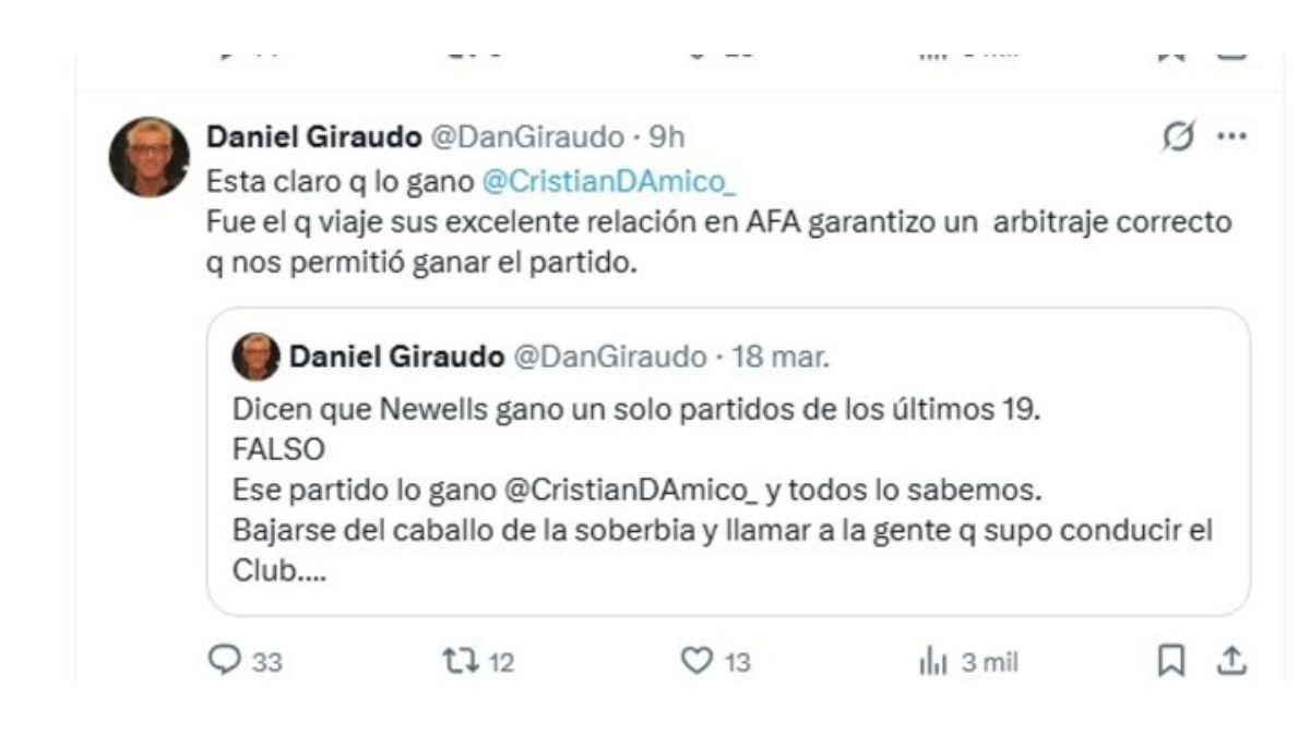 Un dirigente opositor a la actual dirigencia de Newell's aseguró que la Lepra le ganó a Huracán de Buenos Aires en el Clausura 2025 gracias a una gestión de Cristian D'Amico, ex vicepresidente, en la AFA. Después, explicó que sólo "garantizó" un buen arbitraje. La polémica se instaló en Santa Fe.
