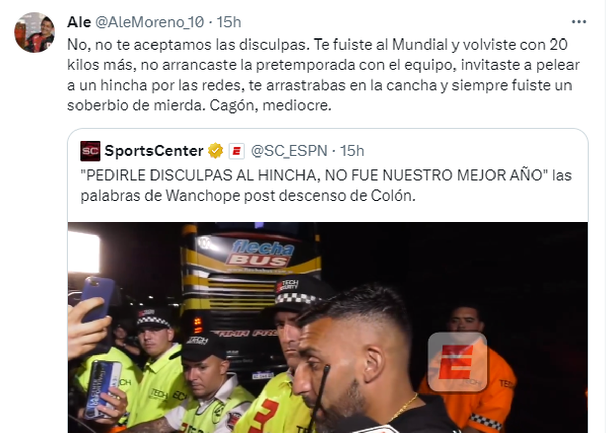 Tras la derrota de Colón, que condenó el descenso del equipo de Israel Damonte, el que salió a dar la cara ante los periodistas presentes fue Wanchoe Ábila. El delantero Sabalero lamentó la pérdida de la categoría y le pedió disculpas a la gente que no fueron aceptadas por los hinchas que se expresaron en las redes sociales.