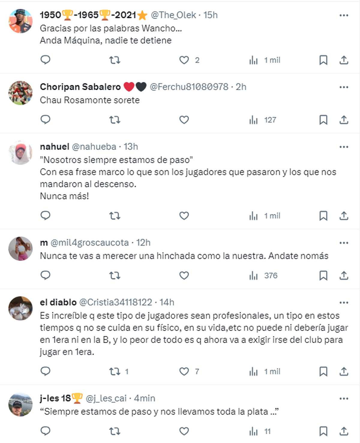 Mientras el delantero daba sus declaraciones, los hinchas se expresaban en las redes sociales y respondían a sus dichos. "No, no te aceptamos las disculpas. Te fuiste al Mundial y volviste con 20 kilos más", dijo un fanático. "Anda Máquina, nadie te detiene", agregó otro.