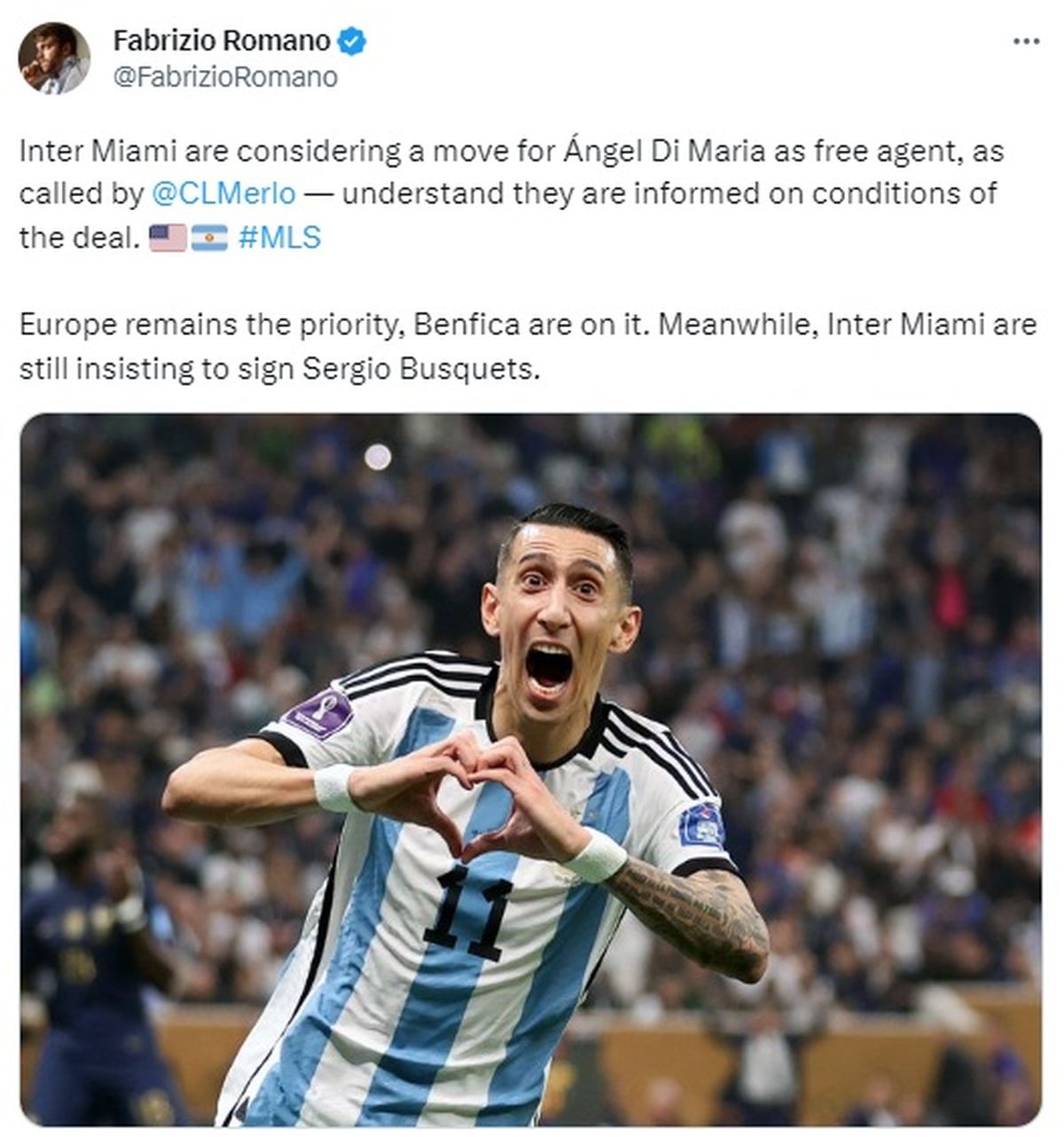 "Inter Miami está considerando la contratación de Ángel Di María como agente libre. Están al tanto de las condiciones del acuerdo, pero Europa sigue siendo prioridad para el jugador que está en la carpeta del Benfica. Mientras Tanto, Inter Miami insiste por Sergio Busquets", publicó el periodista en su cuenta de Twitter.