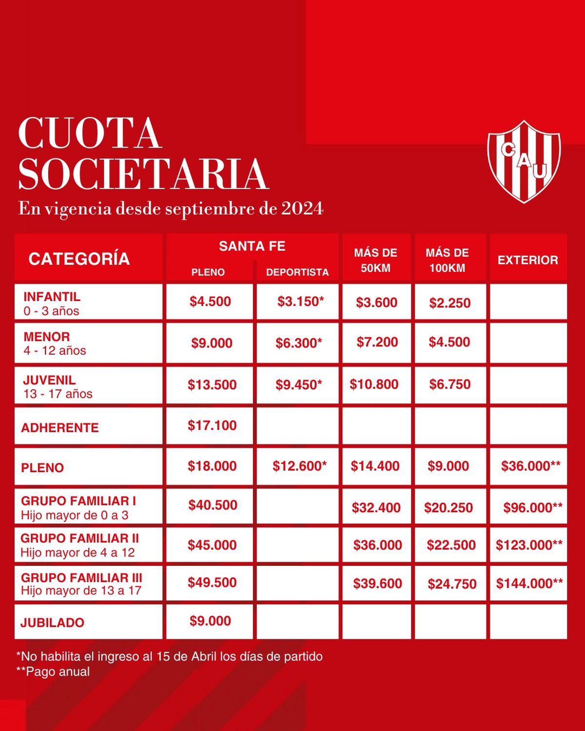 El Club Atlético Unión informó que para el mes de septiembre, la cuota societaria sufrirá un aumento de un 20%.