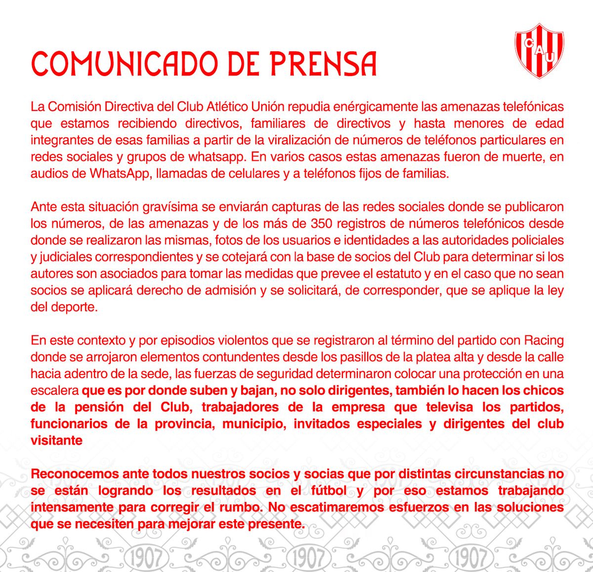 A raíz de las amenazas y mensajes intimidatorios recibidos en los últimos días, la dirigencia de Unión, encabezada por Luis Spahn, emitió un comunicado repudiando todo lo ocurrido y revelando que derivará todo a manos de la Policía y la Justicia.