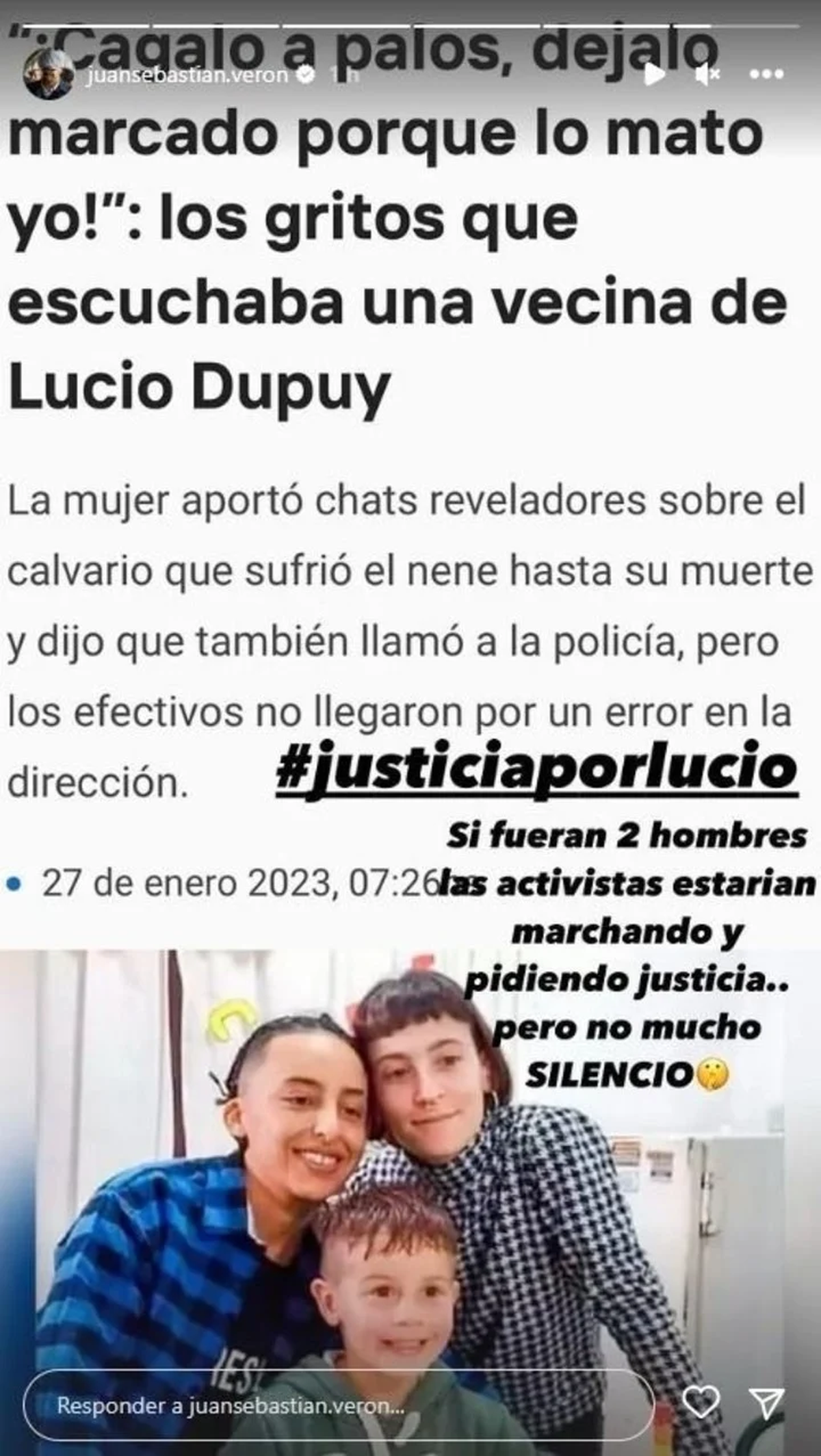 Sebastián Verón tomó la captura de la noticia de un portal de La Plata y encima de la imagen escribió: "Si fueran dos hombres, las activistas estarían marchando y pidiendo justicia…pero no, mucho silencio". Y agregó el hashtag #JusticiaporLucio.