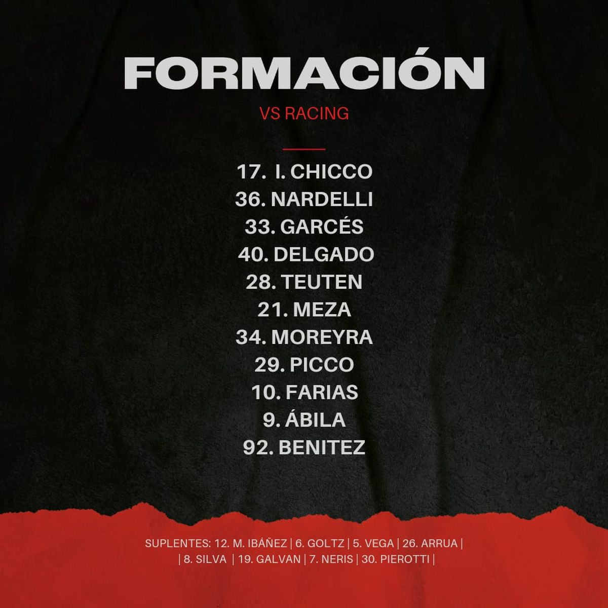 Gorosito dispuso los ingresos del volante Stéfano Moreyra y Andrew Teuten, y el delantero Jorge Benítez por el defensor Paolo Goltz, y los volantes Baldomero Perlaza y Juan Pablo Álvarez, con respecto al equipo que empató 1-1 con Rosario Central.
