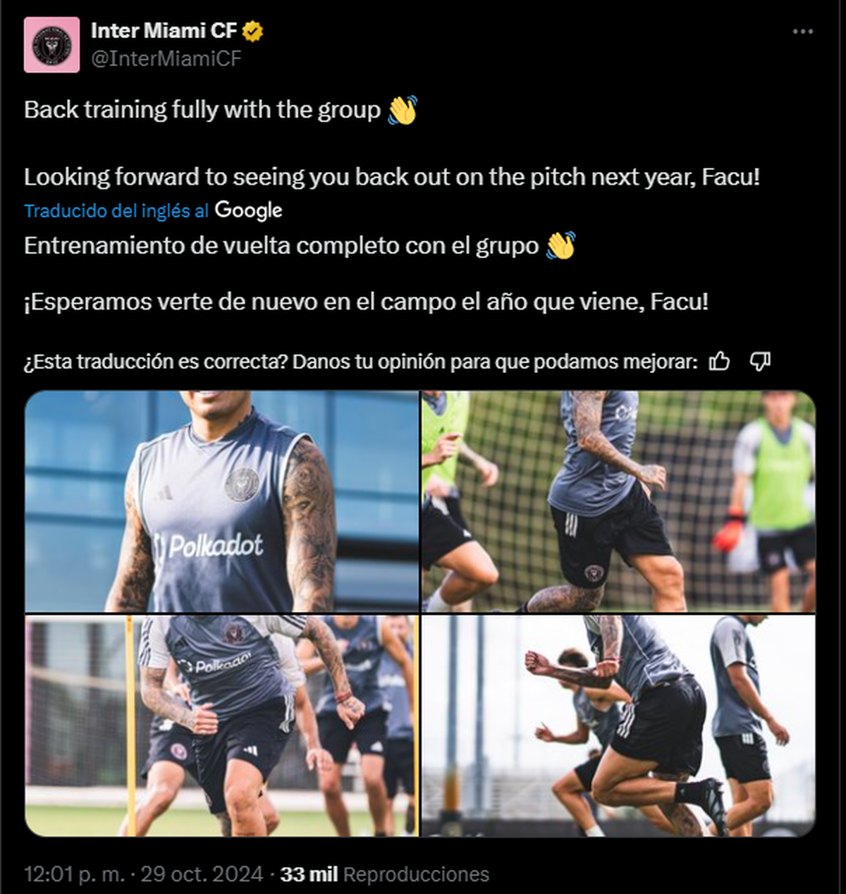 Facundo Farías volvió a las canchas tras 10 meses de recuperación y el Inter Miami compartió su alegría en las redes sociales. El santafesino y ex Colón, que se lesionó en enero de este año durante un amistoso, regresó a las canchas y entrenó a la par de sus compañeros.