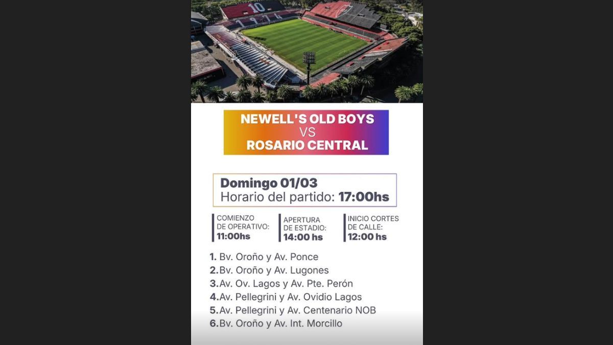 El operativo de seguridad dará inicio en la tarde del domingo, a las 11, con un registro previo del perímetro externo del estadio "Marcelo Bielsa", para luego inspeccionar el interior. La "apertura de puertas" para el ingreso de hinchas será a partir de las 14, mientras que el inicio de cortes y desvíos de calles será desde las 12.