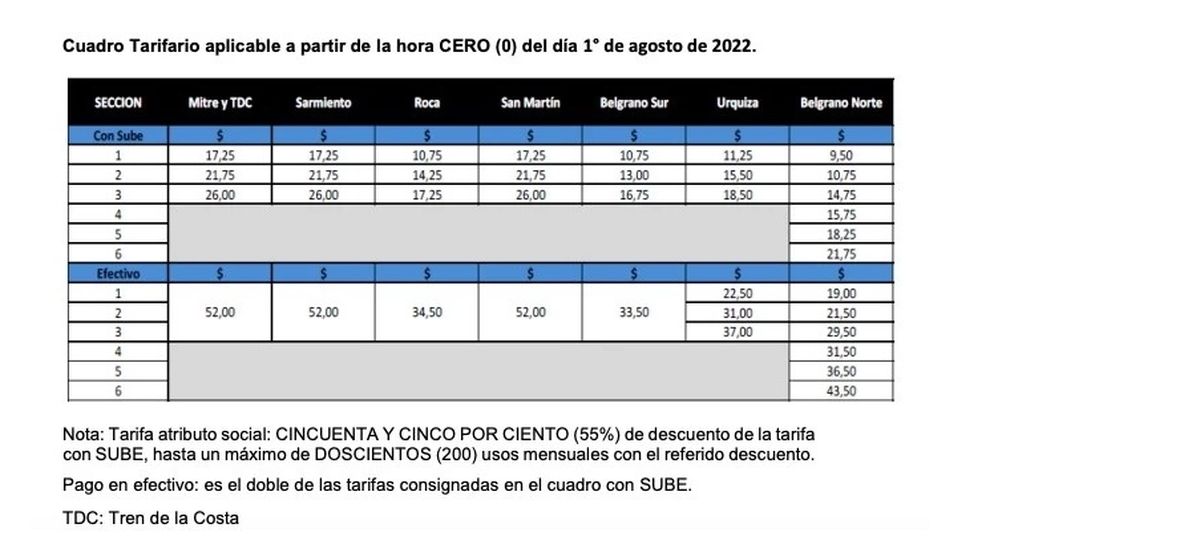 A través de la resolución 469/2022, publicada en el Boletín Oficial, el proyecto de modificación del cuadro tarifario detalla cómo quedarán los montos, que impactarán en las líneas de colectivos y trenes. Los valores estaban congelados desde hacía tres años.