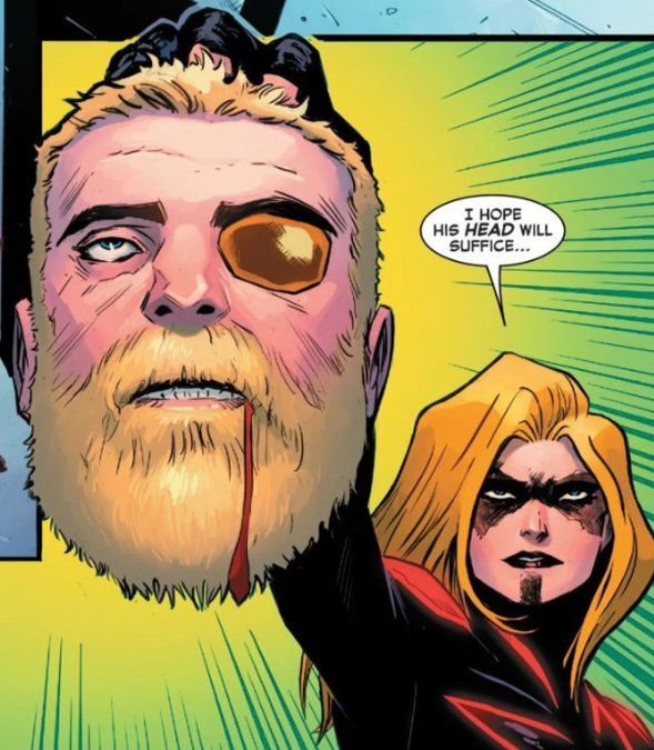 Allí es cuando Capitana Marvel arremete en su forma binaria contra Thor. La siguiente viñeta es simplemente terrorífica. Esta villana le ha arrancado la cabeza al asgardiano.