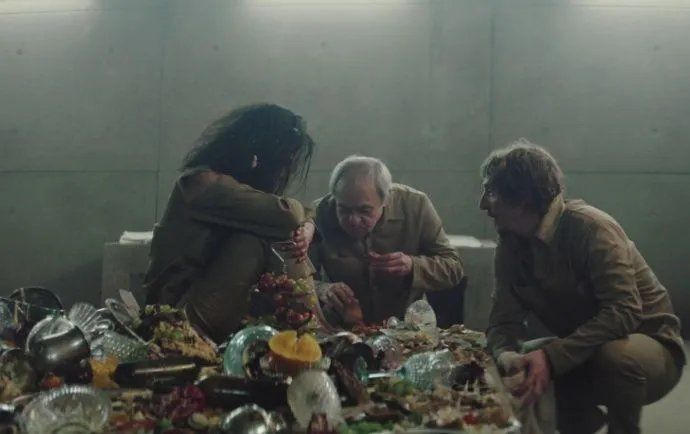 Todos los días pasa una gran plataforma con un inmenso banquete, aunque ambos sujetos no podrán verlo completo, pues solo quedara lo que hayan decidido dejarles los de arriba.