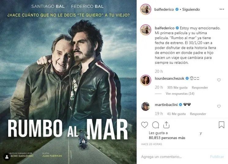"Estoy muy emocionado. Mi primera película y su ultima película. 'Rumbo al mar' ya tiene fecha de estreno. El 30/1/20 van a poder disfrutar de esta historia llena de emoción en donde padre e hijo hacen un viaje que cambiara para siempre su relación", escribió en su cuenta de Instagram, súper emocionado junto al póster oficial del filme.