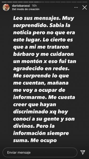 "Leo sus mensajes. Muy sorprendido. Sabía la noticia pero no que era este lugar. Lo cierto es que a mí me trataron bárbaro y me cuidaron un montón por eso fui tan agradecido en redes. Me sorprende lo que cuentan, mañana me voy a ocupar de informarme", aseguró el presentador televisivo en su descargo.