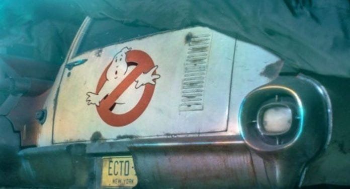 La imagen muestra al Ecto-1 dirigiéndose, a través de un descampado, hacia un vórtice de energía verde en el cielo.