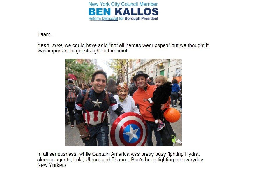Eso fue justo lo que sucedió con el concejal de la ciudad de Nueva York, Ben Kallos, quien tuvo la ocurrencia de mandar un newsletter promoviendo sus acciones, con una foto de él disfrazado de Capitán América.
