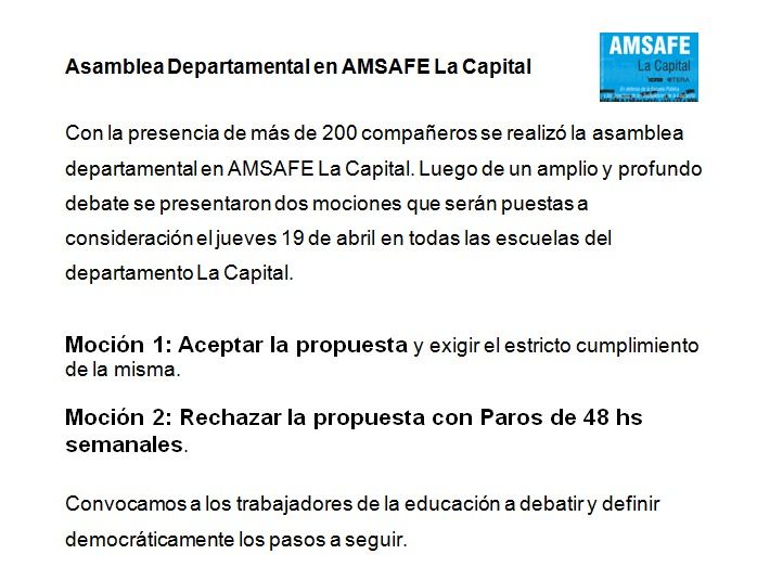 AMSAFE: Este miércoles por la tarde se elaborarán las mociones en las asambleas departamentales. Se votará durante el jueves y se sintetizará la opinión de todos los docentes que voten en la Asamblea Provincial del viernes 20 de abril.