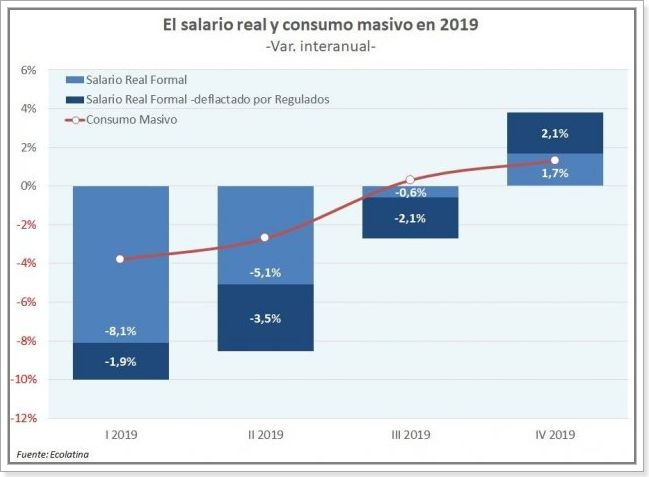 Desde Ecolatina, estiman una caída cercana a 1% interanual del consumo masivo –un retroceso menor al de la totalidad del consumo privado-, que comenzaría a mostrar variaciones interanuales positivas a partir del tercer trimestre, “cuando el poder adquisitivo de los salarios experimente mejoras parciales respecto al 2018”.