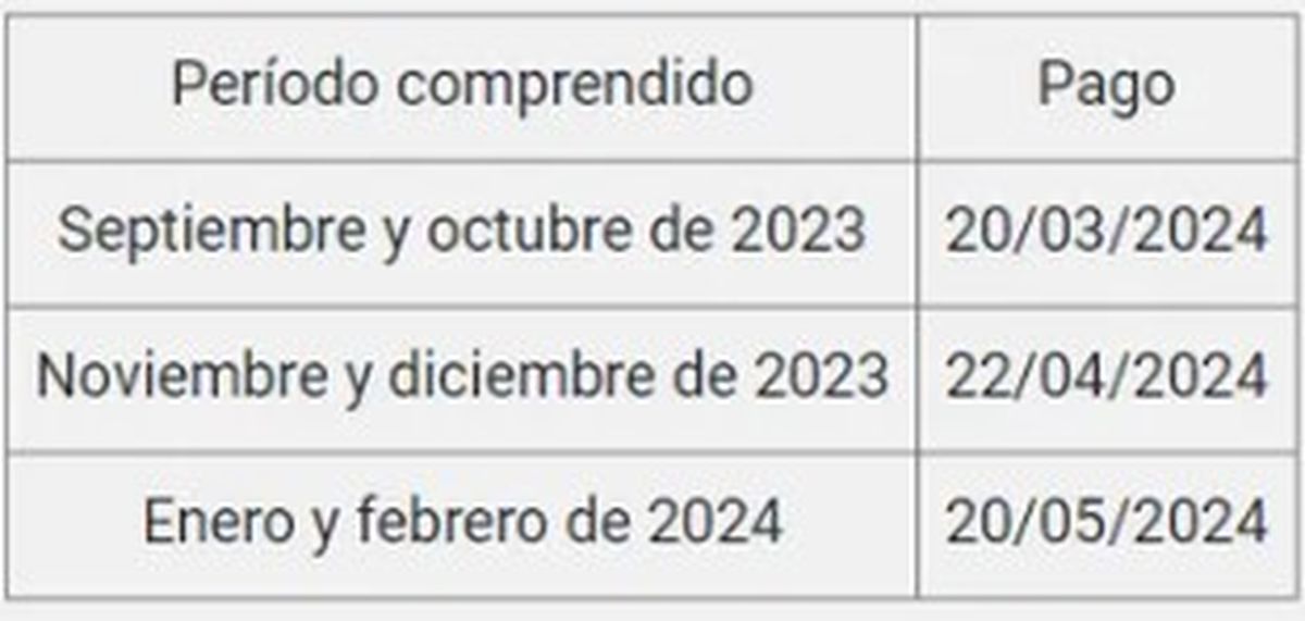 Según detalla la Resolución General 5411/2023, se prorroga el vencimiento del pago del impuesto integrado -componente impositivo- de la obligación mensual correspondiente a los períodos septiembre, octubre, noviembre y diciembre de 2023 y enero y febrero de 2024, a cargo de los pequeños contribuyentes adheridos al Régimen Simplificado para Pequeños Contribuyentes (RS) que se encuentren encuadrados en las categorías A, B, C y D, los que deberán ingresarse en las fechas que se detallan a continuación: