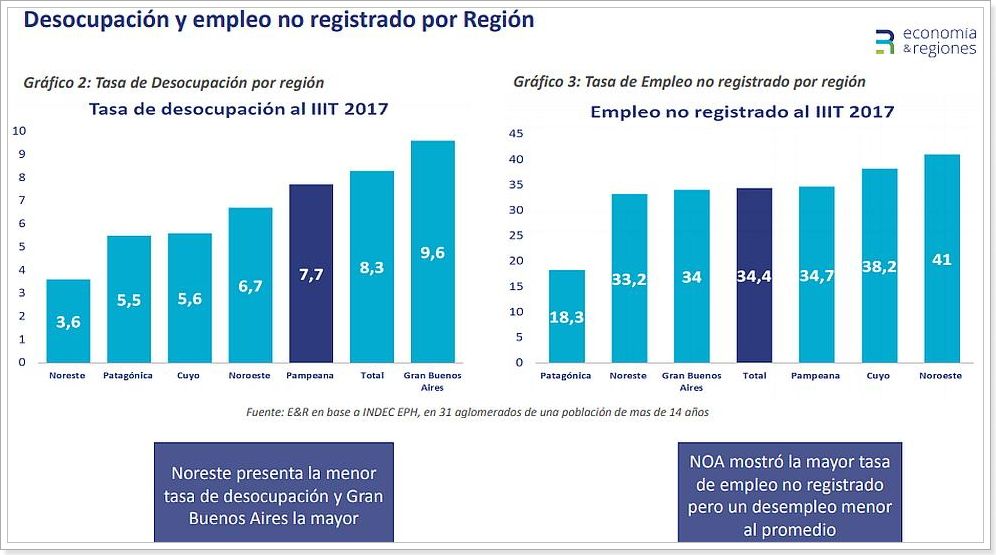 El Gran Buenos Aires con un 9,6% y la Región Pampeana con 7,7% registraron las mayores tasas de desocupación; mientras que el Noroeste Argentina (NOA) con 41% y Cuyo con 38,2% lideran el ranking de regiones con mayor empleo no registrado.