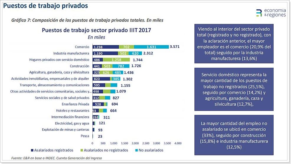 Dentro del sector privado, que en sus 7,17 millones de puestos registrados incluyen los bancos y empresas públicas, así como entes y medios de comunicación del Estado, Comercio es el mayor empleador con el 20,9% del total de registrados, seguido por la industria manufacturera con el 13,6%.