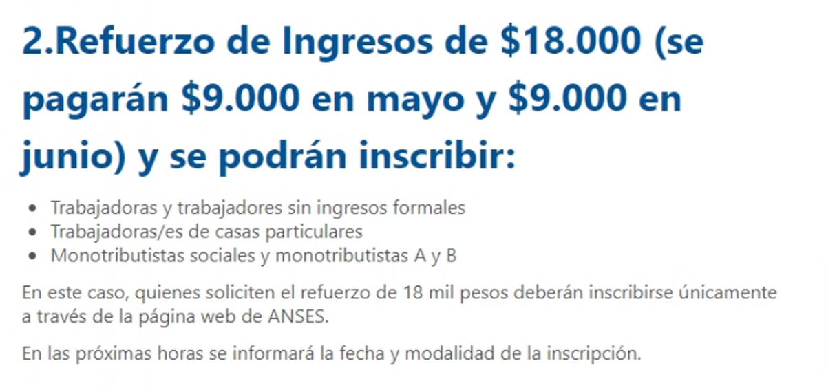 Según el sitio web de Anses, pueden acceder a este refuerzo las/os trabajadoras/es sin ingresos formales, trabajadoras y trabajadores de casas particulares y monotributistas sociales y de las categorías A y B.