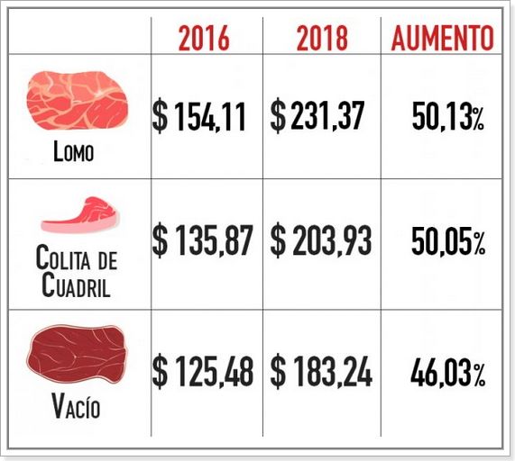 La misma evolución sufrieron la picada común que subió un 69% y la paleta (70,94%) mientras que cortes premium el lomo “apenas” subieron un 50,13% y el vacío un 46,03%.