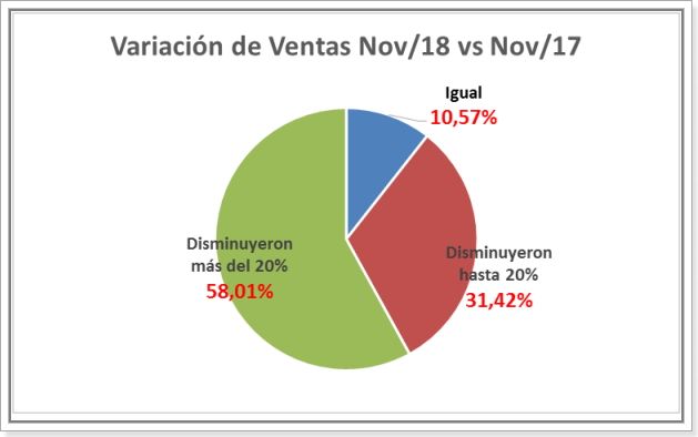 Así se desprende del último informe del DIES para el mes de noviembre, donde sólo el 10,57% de los encuestados declaró niveles similares, pero un preocupante alto porcentaje (89,43%) reconoció haber vendido menos que en noviembre del 2017, con distintos porcentajes de descensos.