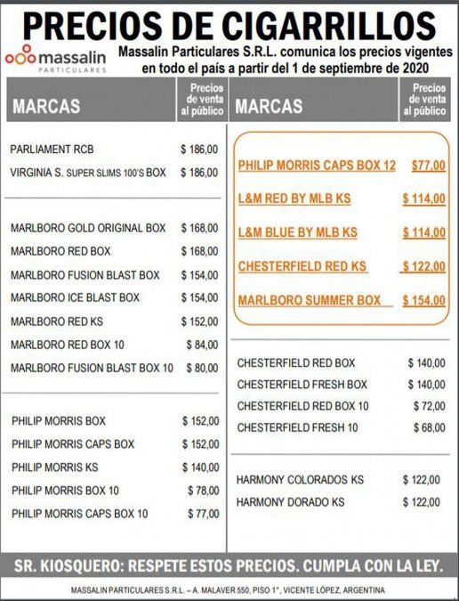 El martes 1 de septiembre fue el turno de la empresa fabricante Massalin Particulares. Desde ese día, los cigarrillos son un 7% más caros. La medida se debe a un aumento de impuestos programado para cada inicio de trimestre. Se trata del cuarto incremento en lo que va del año, y el próximo será el 1 de diciembre.